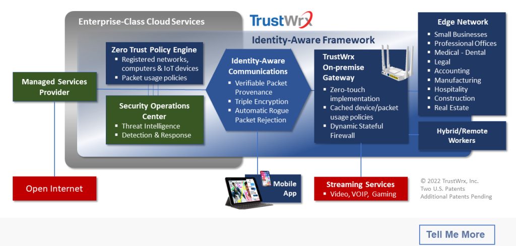 By giving packets verifiable identity, precisely controlling packet usage and significantly collapsing the threat surface, TrustWrx brings the value of corporate-class Zero Trust security to the small enterprise customers of the MSP.